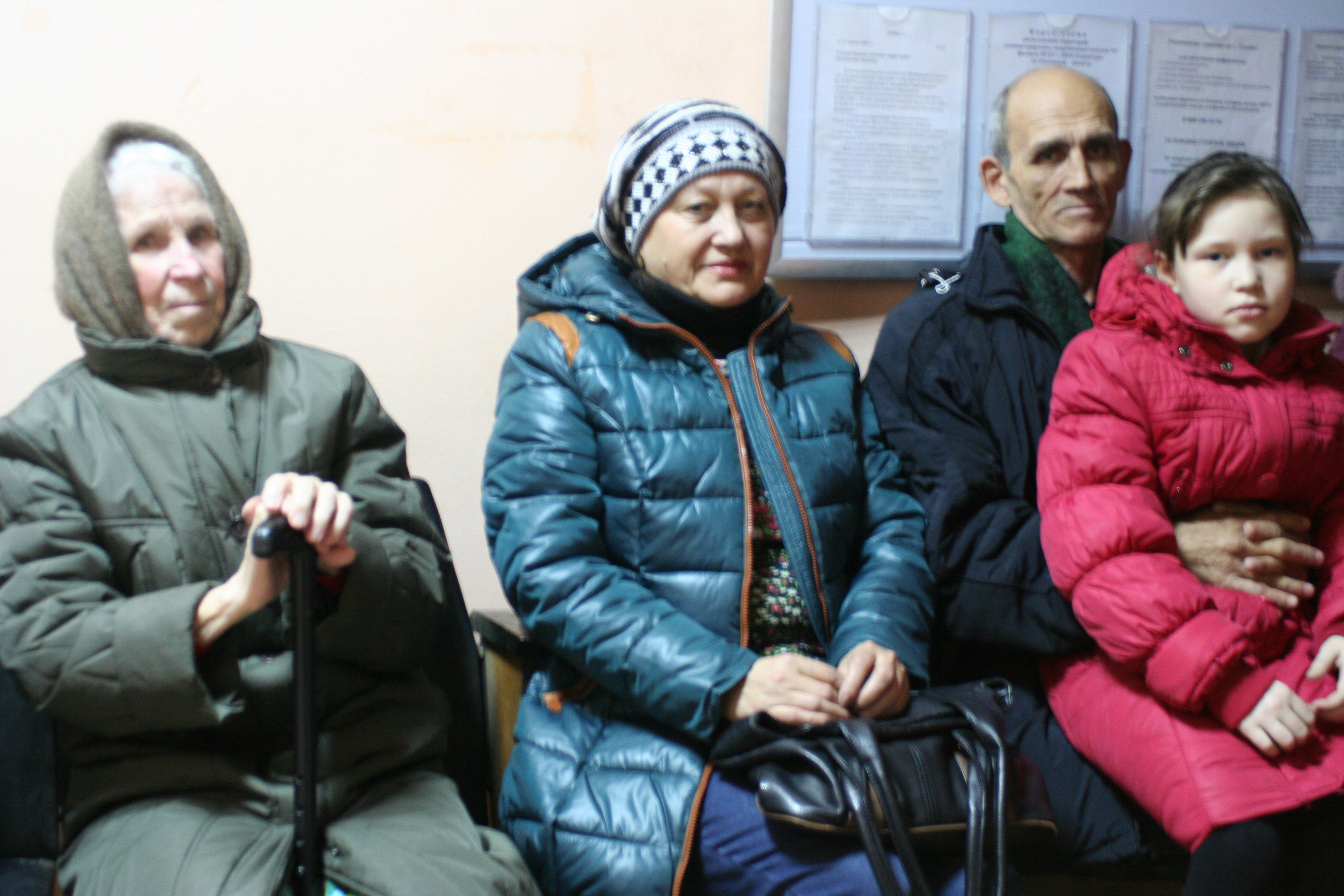 Беженцы в ожидании очереди на одеял. Женщина в середине одета в курточку предоставленную ей АДРА.